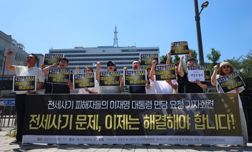 대통령 면담 요청하는 전세사기 피해자들 (서울=연합뉴스) 김도훈 기자 = 전세사기·깡통전세피해자 전국대책위원회, 전세사기·깡통전세 문제해결을 위한 시민사회대책위원회 관계자들이 10일 서울 용산 대통령 집무실 인근에서 전세사기 문제 해결 촉구 대통령 면담 요청 기자회견을 하고 있다. 2025.7.10 superdoo82@yna.co.kr |