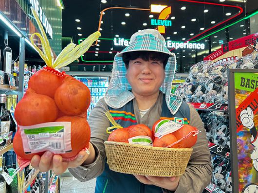모델이 세븐일레븐에서 판매하는 거창 양파를 소개하고 있다. [사진=세븐일레븐] |