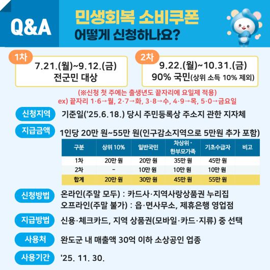 소비 쿠폰은 1차와 2차로 나눠 단계적으로 지급되며 인구 감소 지역인 완도군은 5만 원이 추가돼 1차로 ▲일반 군민 20만 원 ▲차상위 계층·한부모 가족 35만 원 ▲기초 생활 수급자 45만 원이 지급된다.
