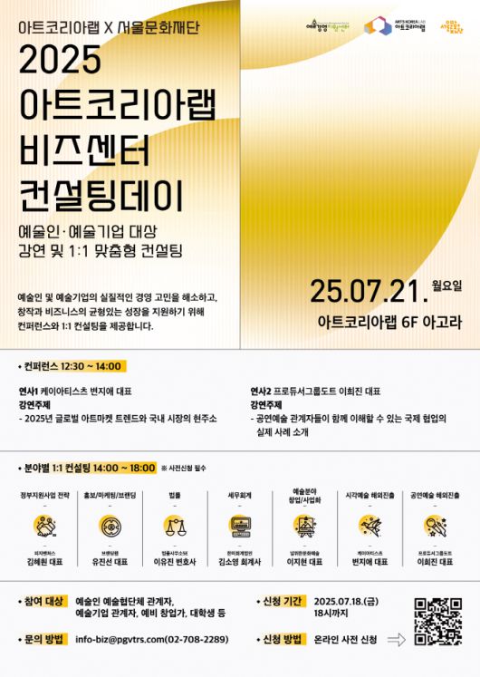컨설팅데이는 서울문화재단, 경기문화재단과의 협력으로 총 2회에 걸쳐 진행된다. 1회차는 이달 21일 서울 종로구 아트코리아랩 6층 AKL아고라에서 서울문화재단과 공동으로 열리며, 2회차는 8월 25일 경기문화재단과 함께 진행된다.