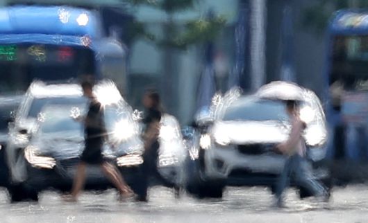 지난해 8월 대구 중구 반월당사거리 인근 달구벌대로에서 시민들이 열기로 가득한 횡단보도를 건너고 있는 모습. 뉴시스 |