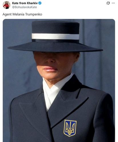 현지시간 15일 소셜미디어 엑스(X)의 한 우크라이나 이용자는 어두운색 챙이 깊은 모자로 얼굴을 절반쯤 가린 멜라니아 여사의 왼쪽 가슴에 우크라이나의 국가 상징인 '트리주브'(삼지창) 로고를 합성한 사진을 게시했습니다.
