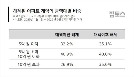16일 부동산 중개업체 '집토스'가 지난달 27일까지 계약된 수도권 아파트의 매매 해제 현황을 분석한 결과, 대책 발표 이후 해제 신고된 계약 중 10억원 초과 비중은 35.0%로 나타났다. 대책 이전(26.9%)보다 크게 증가한 것으로, 대출 규제를 직접 받지 않는 기존 계약자들마저 향후 집값 하락에 대한 불안감으로 계약을 포기하고 있음을 시사한다.