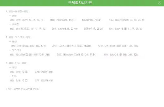 16일 북한 국가관광총국이 운영하는 조선관광 사이트의 ‘국제렬차시간표’에는 현재 평양-베이징, 평양-단둥, 평양-모스크바 등 세 가지 운행편이 게시돼 있다.