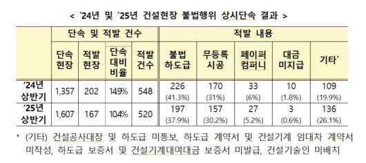 단속현장 대비 적발현장 비율(적발률)은 지난해 상반기 대비 4.5%p 감소했으며, 불법하도급(197건, 37.9%)이 여전히 가장 큰 비중을 차지하고 있는 것으로 나타났다.