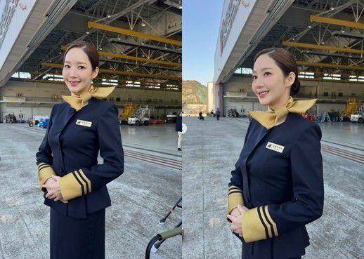 사진 속 박민영은 남색 바탕에 금빛이 가미된 승무원 복장을 하고 단아한 분위기를 보이고 있다.
