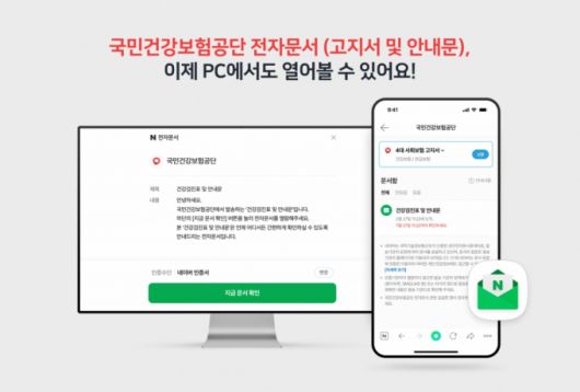 지난 15일부터 기존 네이버 앱(애플리케이션)에 더해 PC와 모바일 웹에서도 네이버 전자문서를 통해 국민건강보험공단의 전자문서를 쉽고 편리하게 열람할 수 있다. 스마트폰, 노트북, 데스크탑, 태블릿PC 등 사용자가 선호하는 디바이스 환경에서 '네이버 전자문서 홈'에 접속해 열람할 문서를 선택하고 네이버 앱으로 수신한 알림을 통해 인증을 완료하면 문서를 열람할 수 있다.