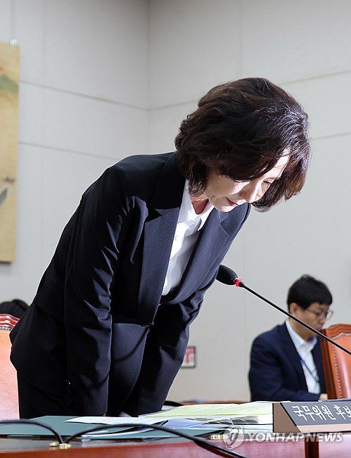 (서울=연합뉴스) 박동주 기자 = 이진숙 사회부총리 겸 교육부 장관 후보자가 16일 서울 여의도 국회 교육위원회에서 열린 인사청문회에서 자녀 조기 유학 등 논란과 관련해 고개숙여 사과하고 있다. 2025.7.16