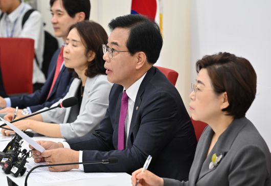 김병기 더불어민주당 대표 권한대행 겸 원내대표(위쪽 사진)와 송언석 국민의힘 비상대책위원장 겸 원내대표가 16일 오전 서울 여의도 국회에서 열린 최고위원회의와 현안관련 기자간담회에서 발언하고 있다. 임세준 기자