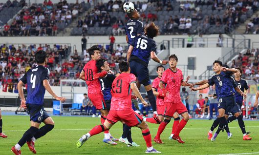 15일 경기도 용인미르스타디움에서 열린 2025년 동아시아축구연맹(EAFF) E-1 챔피언십(동아시안컵) 남자부 최종 3차전 한국과 일본의 경기. 일본 모치즈키 헨리 히로키가 공중볼을 따내고 있다. 연합뉴스 |