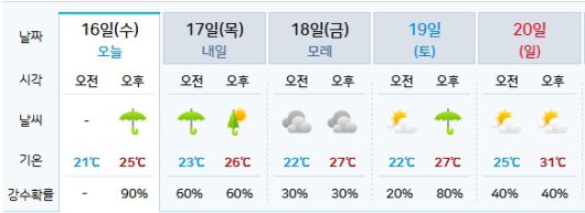 17일 목요일도 오전부터 오후까지 비가 이어질 전망이며, 낮 기온은 26도로 다소 올라간다. 18일 금요일은 흐린 날씨가 이어지고, 기온은 27도까지 상승하지만 강수확률은 30%로 다소 줄어든다.