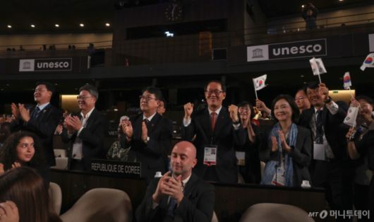 (파리=뉴스1) 이준성 기자 = 최응천 국가유산청장(왼쪽 세번째)과 박상미 주유네스코 대표부 대사(오른쪽), 그리고 정부대표단, 부산시 관계자 등이 16일(한국시간) 프랑스 파리 유네스코 본부에서 열린 제47차 유네스코 세계유산위원회에서 차기 세계유산위원회 개최지로 대한민국 부산이 확정되자 환호하고 있다. 2025.7.16/뉴스1 Copyright (C) 뉴스1. All rights reserved. 무단 전재 및 재배포, AI학습 이용 금지. /사진=(파리=뉴스1) 이준성 기자 |