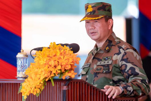 지난 14일(현지시간) 캄보디아 실권자 훈센 상원의장의 아들인 훈 마넷 캄보디아 총리가 왕립헌병대 창설 32주년 기념식에서 연설하고 있다. 훈마넷 총리는 이날 태국과의 국경갈등이 고조되고 있는 것을 이유로 내년부터 의무징집법을 발동, 민간인 징집을 시작할 것이라 밝혔다/AFP 연합뉴스 |