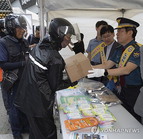 (서울=연합뉴스) 황광모 기자 = 16일 서울 강남구 강남역 사거리에서 열린 5대 반칙운전 근절을 위한 행사에서 백현석 강남경찰서장을 비롯한 내빈들이 이륜차 운전자들에게 안전 운행을 위한 홍보물과 규격 오토바이 헬멧을 증정하고 있다.
