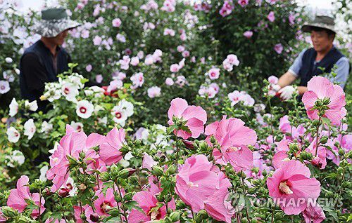 (수원=연합뉴스) 홍기원 기자 = 제헌절을 하루 앞둔 16일 경기도 수원시 권선구 수원무궁화원에서 관계자들이 활짝 핀 무궁화를 돌보고 있다. 2025.7.16