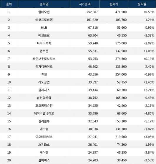 한편 시가총액 20위권 종목들은 클래시스(214150) ▲2.21%, 삼천당제약(000250) ▼0.48%, 코오롱티슈진(950160) ▼2.17%, 실리콘투(257720) ▼5.17%, 에스엠(041510) ▼1.87%, 이오테크닉스(039030) ▲3.05%, JYP Ent.(035900) ▼1.98%, 케어젠(214370) ▼3.84%, 펄어비스(263750) ▼2.53% 등의 성적을 기록하고 있다.