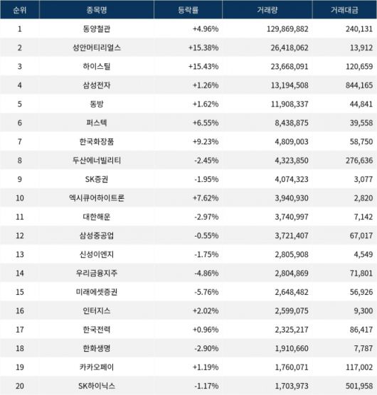 하이스틸(071090)이 4,900원으로 15.43% 상승한 가운데 거래량은 2천3백6십만주를 기록하고 있다. 삼성전자(005930)는 64,500원으로 1.26% 상승세를 보이며, 거래량 1천3백만주를 넘어서고 있다. 동방(004140)은 3,755원, 퍼스텍(010820)은 4,555원으로 각각 1.62%와 6.55% 상승하고 있다. 한국화장품(123690)은 11,360원으로 9.23% 오르며, 두산에너빌리티(034020)는 63,700원으로 2.45% 하락하고 있다. SK증권(001510)과 엑시큐어하이트론(019490)은 각각 1.95%와 7.62%의 등락률을 기록 중이다.