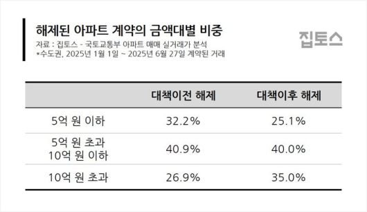 [서울=뉴시스] 부동산 중개업체 집토스가 올해 1월부터 지난달 27일까지 계약된 수도권 아파트 매매 해제 현황을 분석한 결과에 따르면 10억원 초과 아파트의 해제 계약 비중이 26.9%에서 35%로 늘었다. 2025.07.16. (자료=집토스 제공) photo@newsis.com *재판매 및 DB 금지 |
