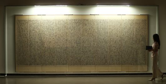 10일 서울 서초구 예술의전당 서울서예박물관에서 열린 ‘평보 서희환: 보통의 걸음’ 전시 프리뷰에서 관계자가 서희환의 ‘월인천강지곡’을 살펴보고 있다. 연합뉴스 |
