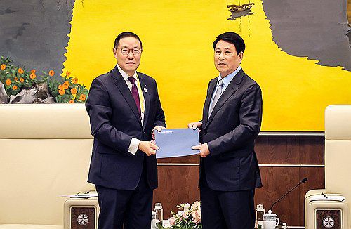 (서울=연합뉴스) 조현상 HS효성 부회장이 15일(현지시간) 베트남 하이퐁에서 르엉 끄엉 베트남 국가주석을 만나 APEC 공식 초청장을 전달하고 있다. 2025.7.16 [HS효성 제공. 재판매 및 DB 금지]
