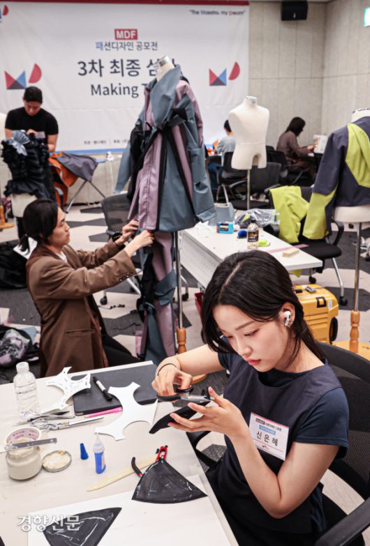 16일 서울 강남구 한국섬유센터에서 열린 MDF 패션디자인 공모전에서 참가 학생들이 작품을 만들고 있다. 비영리 장학재단인 엠디재단이 주최하는 이 행사는 국내외 패션 디자인 관련 학과 학생들의 꿈을 위해 국내 최대 규모의 장학금을 지원하는 공모전으로 올해 6회째를 맞고 있다. 사진=엠디재단 제공