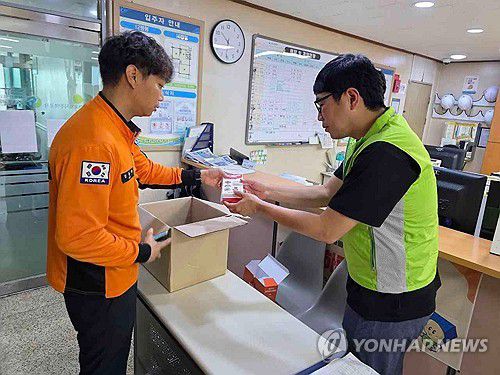 (춘천=연합뉴스) 강원 춘천소방서는 16일 화재 시 스스로 대피가 어려운 노인·장애인 거주자가 많은 노후 아파트 2곳에 습식 방연 마스크, 멀티탭용 자동소화 패치 등 화재 안전 물품을 보급하고 있다. 2025.7.16 [춘천소방서 제공. 재판매 및 DB 금지]