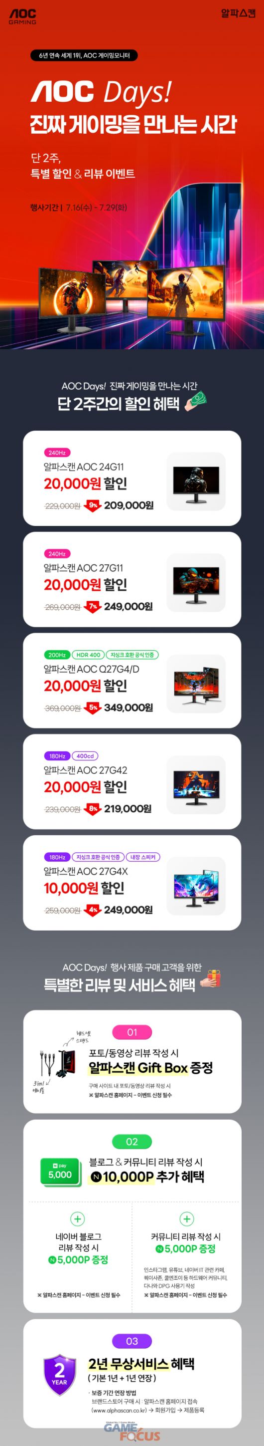 (주)알파스캔디스플레이가 AOC 게이밍 모니터의 6년 연속 세계 1위를 축하하는 2025 AOC Days 행사를 열고 2주 동안 AOC 인기 게이밍 모니터 5종에 대해 할인 및 리뷰 혜택을 제공한다.