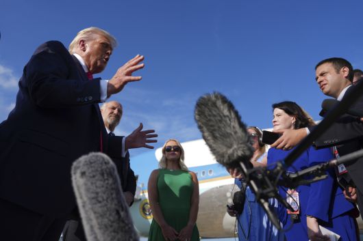 도널드 트럼프(왼쪽) 미국 대통령이 15일(현지시간) 펜실베이니아주 피츠버그에서 열린 행사 참석을 마치고 워싱턴D.C. 인근 메릴랜드주 앤드루스 공군기지에 도착해 기자들의 질문에 답변하고 있다. 워싱턴D.C./AP연합뉴스 |