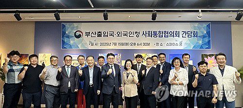 (부산=연합뉴스) 부산출입국외국인청은 외국인의 사회통합 지원을 위해 구성된 사회통합협의회 자원봉사 위원과 간담회를 열었다고 16일 밝혔다. 사진은 간담회 이후 기념 촬영을 하는 부산출입국외국인청 관계자들. 2025.7.16 [부산출입국외국인청 제공. 재판매 및 DB 금지]