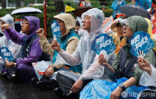 [서울=뉴스핌] 윤창빈 기자 = 양경수 전국민주노동조합총연맹(민주노총) 위원장이 16일 오후 서울 여의도 국회의사당역 앞에서 열린 노조법 2·3조 즉각 개정! 윤석열 정권 반노동정책 즉각 폐기! 노정교섭 쟁취! 민주노총 총파업 대회에서 구호를 외치고 있다. 2025.07.16 pangbin@newspim.com