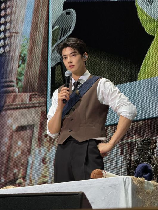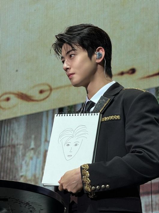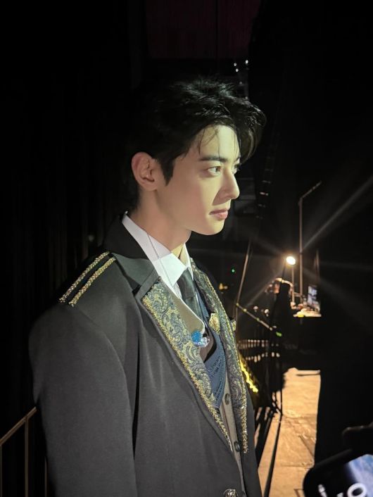 사진 속 차은우는 왕자님을 연상케 하는 고풍스러운 수트 룩을 선보였다. 블랙 테일러드 재킷에는 골드 자수와 숄더 디테일이 더해져 클래식하고 웅장한 무드를 자아냈다. 섬세한 헤어 세팅과 옅은 음영 메이크업은 무대의 긴장감 속에서도 차분한 카리스마를 더한다.