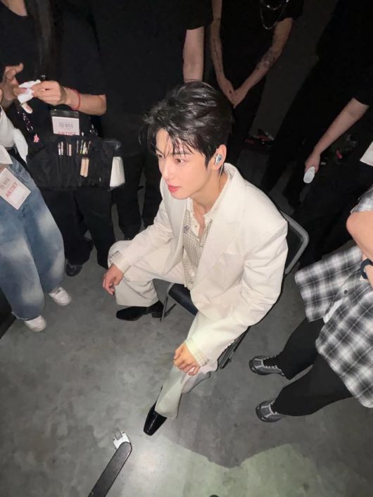 백스테이지에서 포착된 차은우는 올 화이트 슈트로 또 다른 무드를 연출했다. 아이보리빛 자켓과 크림 컬러 셔츠, 넓은 팬츠 핏까지 매끈하게 정돈된 스타일은 고급스러움을 담아냈다.