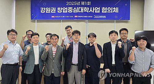 (춘천=연합뉴스) 지난 15일 강원대학교 춘천 캠퍼스에서 2025년 가 열렸다. 협의체는 중소벤처기업부 창업중심대학사업 강원권역 주관기관인 강원대를 중심으로 한림대, 강릉원주대 등 6개 협력대학과 강원특별자치도, 강원지방중소벤처기업청, 춘천시 등 11개 협력 기관, 12개 협력투자사가 참여하고 있다. 사진은 관계자들이 기념 촬영을 하는 모습. 2025.7.16 [강원대학교 제공. 재판매 및 DB 금지]