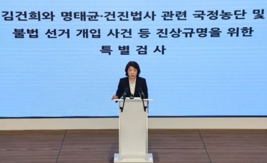윤석열 전 대통령 부인 김건희 여사와 관련한 각종 의혹 사건을 수사하는 민중기 특별검사팀 오정희 특검보가 8일 서울 종로구 KT광화문빌딩에서 정례 브리핑을 하고 있다. 연합뉴스 |