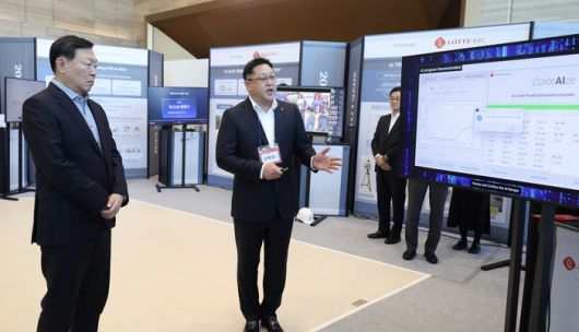 롯데그룹 신동빈 회장(왼쪽)이 지난 1월 9일 서울 롯데월드타워에서 열린 ‘2025 상반기 VCM’에 앞서 롯데케미칼의 ‘AI 기반 컬러 예측 시스템’에 대한 설명을 듣고 있다. 롯데그룹 제공 |