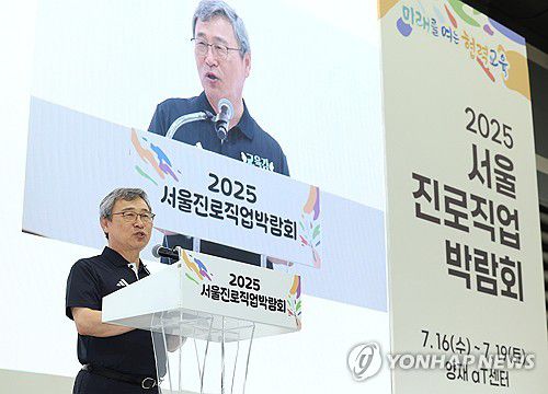 (서울=연합뉴스) 정근식 서울시교육감이 16일 서울 서초구 aT센터에서 열린 '2025 서울진로직업박람회'에서 인사말을 하고 있다. 2025.7.16 [서울시교육청 제공. 재판매 및 DB 금지]