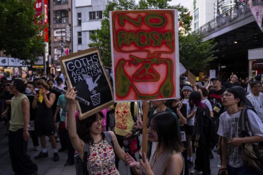 일본 상원 선거를 일주일 앞둔 지난 13일 도쿄 신주쿠에서 시민들이 인종 차별 및 민족주의 정당 참정당에 반대하는 시위를 펼치고 있다./AP 연합