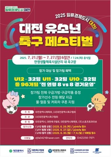 (사)대전광역시축구협회(회장 이계혁)가 전국에 축구 꿈나무들이 참여하는 유소년 축구 페스티벌은 ‘2025 일류 경제도시 대전 유소년 축구 페스티벌’을 7월 21일~7월 27일까지 대전 중구 안영생활체육시설단지 내 축구장에서 개최한다.