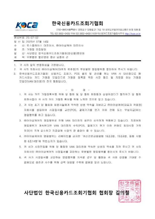 한신협은 최근 토스플레이스와 아이샵케어 측에 “지급결제 시장 질서를 교란하는 공격적 영업행위를 즉시 중단해 달라”는 내용의 공문을 발송했다. 공문에는 아이샵케어가 시중에서 20~30만 원 상당의 카드단말기를 일부 가맹점에 무료 또는 저가에 제공하고 있다는 의혹이 담겼다.