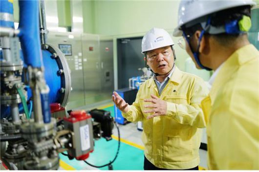 윤석대 한국수자원공사 사장(사진 오른쪽 두 번째)이 16일 경북 고령군 소재 고령 광역정수장의 고도정수처리 시설에서 후오존 설비를 점검하고 있다.  2025.07.16 yuna7402@newspim.com