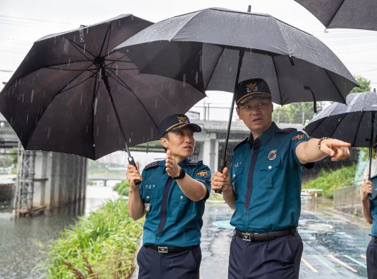 박현수 서울경찰청장 직무대리(오른쪽)는 16일 오후 서울 서대문구 증산교 일대 불광천 및 하부도로를 중심으로 풍수해 취약지역에 대한 현장점검을 실시했다. [서울경찰청 제공] |