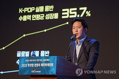 (서울=연합뉴스) 이재상 하이브 대표가 16일 제주 롯데호텔에서 열린 '2025 한경협 CEO 제주하계포럼'에 참석해 기조강연을 하고 있다. 2025.7.16 [한국경제인협회 제공. 재판매 및 DB 금지]