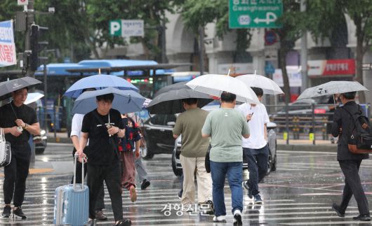 우산을 쓴 시민들이 지난 14일 서울 광화문 사거리 횡단보도를 건너고 있다. 사진은 기사와 무관. 경향신문 자료사진 |
