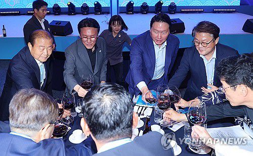 (경주=연합뉴스) 김도훈 기자 = 김민석 국무총리(윗줄 두번째)와 최태원 대한상공회의소 회장(윗줄 오른쪽 두번째)이 16일 경북 경주시 라한셀렉트 호텔에서 열린 제48회 대한상공회의소 하계포럼에서 참석자들과 건배하고 있다. 2025.7.16