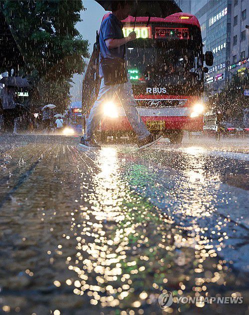 (서울=연합뉴스) 이진욱 기자 = 비가 내리는 16일 서울 강남역 인근에서 시민들이 우산을 쓴 채 이동하고 있다. 이날 기상청은 중부지방과 호남을 중심으로 많은 비를 예보했다. 2025.7.16