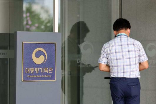 세종시에 위치한 대통령기록관 출입문 앞에서 한 관계자가 내부로 들어서고 있다. 연합뉴스 |