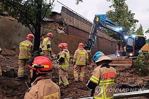(오산=연합뉴스) 16일 오후 7시 4분께 경기 오산시 가장교차로 고가도로의 10m 높이 옹벽이 도로로 무너지며 차량 2대를 덮치는 사고가 발생해 소방대원들이 구조작업을 하고 있다.