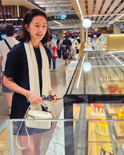 김희애는 16일 자신의 인스타그램에 “화이트 애정템 두르고 맛나보이는 케이크 구경중”이라는 글과 함께 근황 사진을 공개했다.