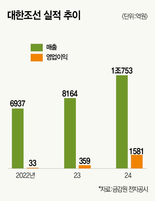 반전은 2022년부터 시작됐다. 워크아웃 돌입 13년 만인 2022년 KHI 컨소시엄에 인수되면서다. 당시 KHI그룹은 한국투자프라이빗에쿼티(PE)·SG PE와 손잡고 약 2000억원을 투입해 대한조선을 인수했다. 케이조선(옛 STX조선해양) 등 조선사 운영 경험이 있는 KHI그룹은 대한조선 인수 후 유상증자와 전환사채(CB) 발행, 무상감자 등을 단행하며 정상화에 나섰다. 마침 조선업이 호황을 맞으며 대한조선 실적도 빠르게 개선됐다.