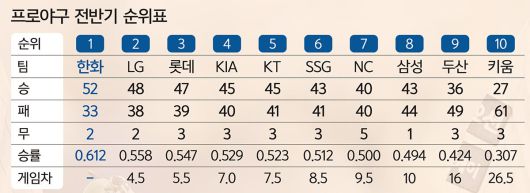 최대 관심사는 역시 한화의 선두 수성 여부다. 전반기에 11승 무패 평균자책점 1.95 탈삼진 161개로 투수 4개 부문 1위(다승·평균자책점·탈삼진·승률)에 오른 코디 폰세와 라이언 와이스로 이어지는 올 시즌 최고의 ‘외국인 투수 원투펀치’에 류현진, 문동주가 뒤를 받치는 선발진의 힘이 한화의 최고 강점이다. 한화 선발진의 평균자책점 3.38은 전체 1위다. 데뷔 3년 차에 한화 마무리를 꿰찬 뒤 리그 최고의 소방수로 성장한 김서현을 정점으로 하는 불펜도 평균자책점 3.51로 리그 전체 2위에 오르며 단단한 마운드 구축에 힘을 보태고 있다. 야구가 ‘투수놀음’임을 감안하면 한화가 후반기에도 강세를 이어가며 선두를 수성할 것이란 관측이 우세하다. 최원호 SBS스포츠 해설위원은 “주전급 투수들의 부상 이탈 같은 변수만 없다면 한화가 1위 경쟁에서 유리할 것”이라고 점쳤다.